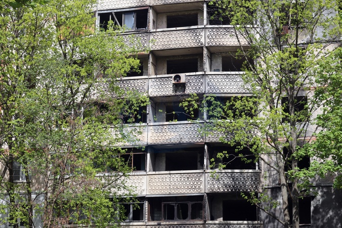 KHARKIV, UKRAINE - APRIL 13, 2024 - Trees come into leaf in spring outside a block of flats damaged by Russian shelling, Kharkiv, northeastern Ukraine., Credit:Vyacheslav Madiyevskyy / Avalon
