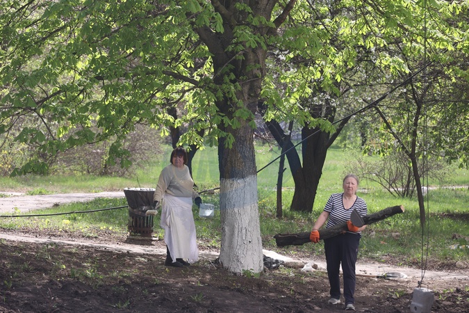 KHARKIV, UKRAINE - APRIL 13, 2024 - People clean the territory by the blocks of flats in Kharkiv, northeastern Ukraine., Credit:Vyacheslav Madiyevskyy / Avalon