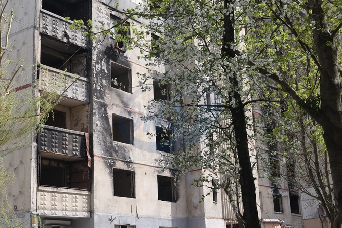 KHARKIV, UKRAINE - APRIL 13, 2024 - A blooming tree is pictured outside a block of flats damaged by Russian shelling in spring, Kharkiv, northeastern Ukraine., Credit:Vyacheslav Madiyevskyy / Avalon