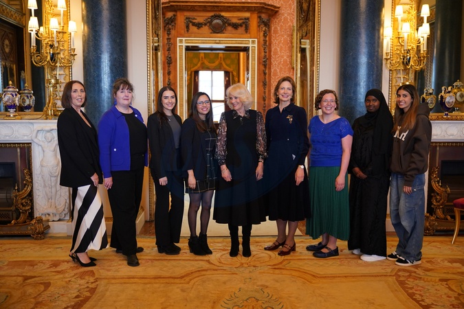 London, UK, 16 April 2024: (left to right) Sally Steadman-South safe young lives programme lead, Chief Executive SafeLives Ellen Miller, young pioneer 'Changemakers' Imi and Maya, Queen Camilla, Chair of Trustees SafeLives Isabel Boyer, young persons authentic voice coordinator Kristie Waller, young pioneer 'Changemakers' Almas and Lybah as Queen Camilla takes part in a discussion, from the SafeLives charity, at Buckingham Palace, London. The group of 14-20 year-olds help to guide the charity's response to issues facing young people, with a particular focus on exploring and promoting healthy relationships., Credit:Yui Mok / Avalon