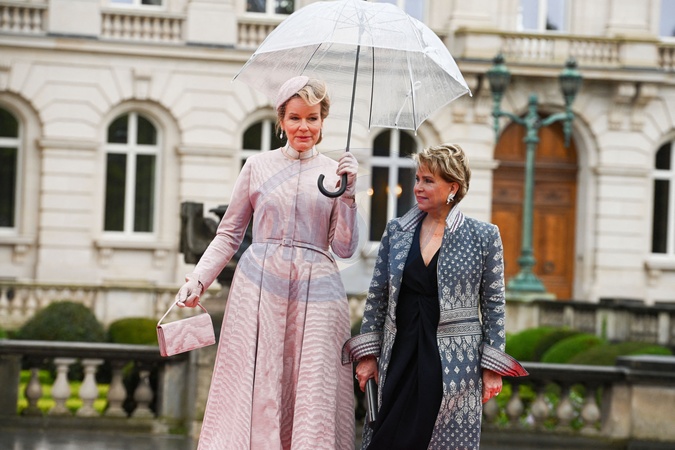 La reine Mathilde de Belgique, la grande-duchesse Maria Teresa de Luxembourg - Le grand-duc Henri de Luxembourg et la grand duchesse Maria Teresa sont en visite d'état à Bruxelles le 16 avril 2024. © Frédéric Andrieu / Bestimage Belgium, Brussels, 16 april 2024 State visit from Luxembourg to Belgium. Grand Duke Henri and his wife Grand Duchess Maria-Teresa Place des Palais for the official welcome by King Philippe and Queen Mathilde. © F.Andrieu / Agencepeps