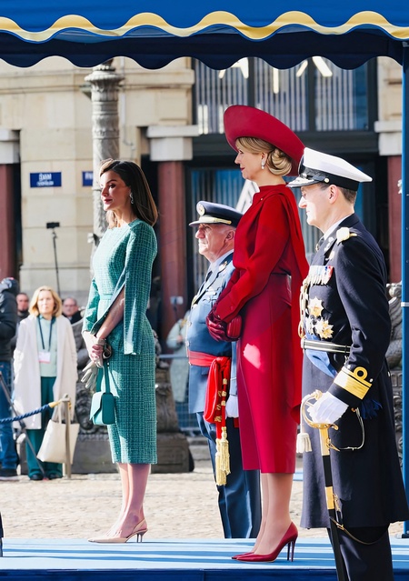 La reine Letizia d'Espagne, La reine Maxima des Pays-Bas - Cérémonie de bienvenue à Amsterdam lors de la visite d'État du couple royal espagnol aux Pays-Bas, le 17 avril 2024. Queen Maxima and King Willem-Alexander with Queen Letizia and King Felipe during the welcomy ceremony at the Dam square in Amsterdam on the 1st day of the 2 days state visit tot he Netherlands. April 17th, 2024.