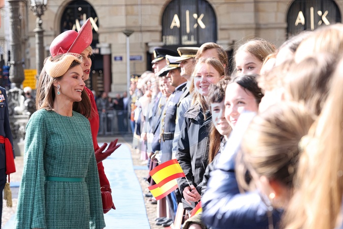 La reine Letizia d'Espagne, La reine Maxima des Pays-Bas - Cérémonie de bienvenue à Amsterdam lors de la visite d'État du couple royal espagnol aux Pays-Bas, le 17 avril 2024. Queen Maxima and King Willem-Alexander with Queen Letizia and King Felipe during the welcomy ceremony at the Dam square in Amsterdam on the 1st day of the 2 days state visit tot he Netherlands. April 17th, 2024.