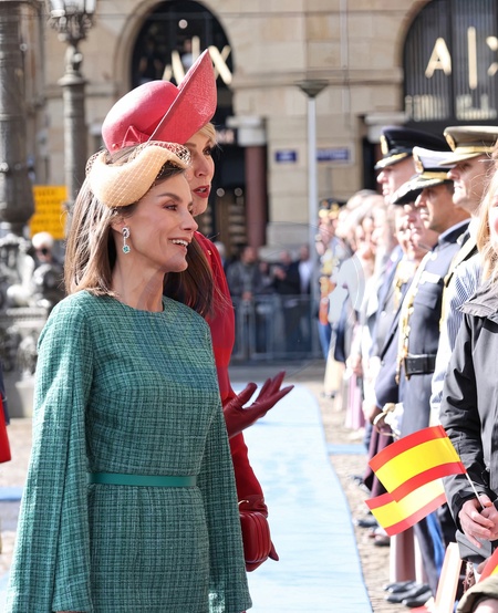 La reine Letizia d'Espagne, La reine Maxima des Pays-Bas - Cérémonie de bienvenue à Amsterdam lors de la visite d'État du couple royal espagnol aux Pays-Bas, le 17 avril 2024. Queen Maxima and King Willem-Alexander with Queen Letizia and King Felipe during the welcomy ceremony at the Dam square in Amsterdam on the 1st day of the 2 days state visit tot he Netherlands. April 17th, 2024.
