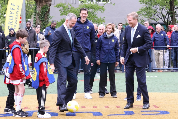 Król Hiszpanii Felipe VI i król Holandii Willem-Aleksander podczas sportowego popołudnia zorganizowanego przez Fundację Cruyffa w Amsterdamie