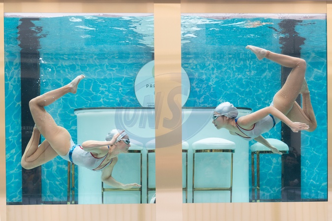 A pair of synchronised swimmers (artistic swimmers) perform in a tank in Covent Garden, London, England, UK on Wednesday 17 April, 2024 as part of a promotion run by On Location - official hospitality provider for the Paris Olympics to draw attention to the fact it is 100 days til the Paris Olympics., Credit:Justin Ng / Avalon