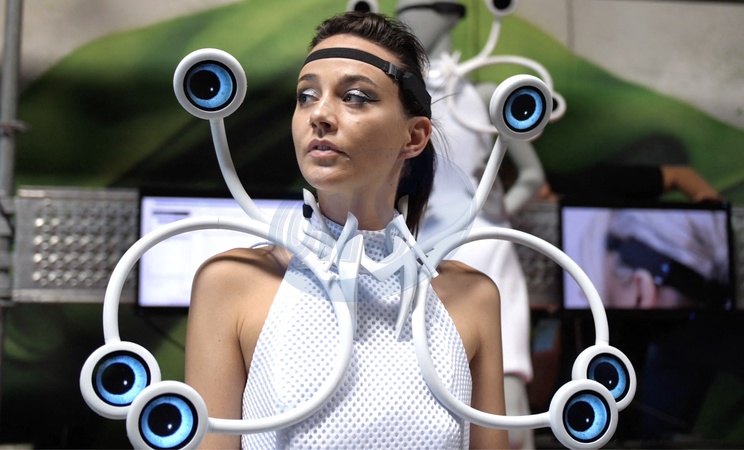Pictures must credit: Anouk Wipprecht A mind-controlled 3D-printed dress offers the ultimate in personal fashion — thanks to built-in displays that respond to the wearer's brain waves. Called Screendress, it was created by Dutch fashion tech designer Anouk Wipprecht. It incorporates a brain interface that measures cognitive load in real-time, this dress shows you how much stimulus the brain gets at any given time. The term 'cognitive load' refers to the amount of information our working memory can process at any moment. The dress shows the wearer's cognitive load to the outside world. Fashion becomes a new kind of interconnection controlled by subconscious signals from the wearer's brain. These signals are picked up using a new cutting-edge EEG sensor contained in a headband that forms a wearable brain-computer interface. The interface uses machine-learning to determine the mental workload of the wearer. The workload is then reflected in real time on the six circular displays flaring out from the dress's sculpted neckpiece. As the wearer's mental workload increases , each display shows an iris and pupil dilating wider and wider. Picture supplied by JLPPA