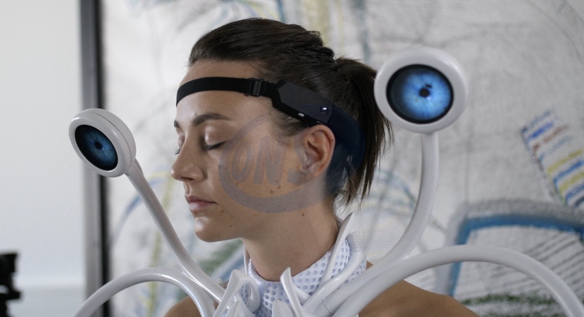 Pictures must credit: Anouk Wipprecht A mind-controlled 3D-printed dress offers the ultimate in personal fashion — thanks to built-in displays that respond to the wearer's brain waves. Called Screendress, it was created by Dutch fashion tech designer Anouk Wipprecht. It incorporates a brain interface that measures cognitive load in real-time, this dress shows you how much stimulus the brain gets at any given time. The term 'cognitive load' refers to the amount of information our working memory can process at any moment. The dress shows the wearer's cognitive load to the outside world. Fashion becomes a new kind of interconnection controlled by subconscious signals from the wearer's brain. These signals are picked up using a new cutting-edge EEG sensor contained in a headband that forms a wearable brain-computer interface. The interface uses machine-learning to determine the mental workload of the wearer. The workload is then reflected in real time on the six circular displays flaring out from the dress's sculpted neckpiece. As the wearer's mental workload increases , each display shows an iris and pupil dilating wider and wider. Picture supplied by JLPPA