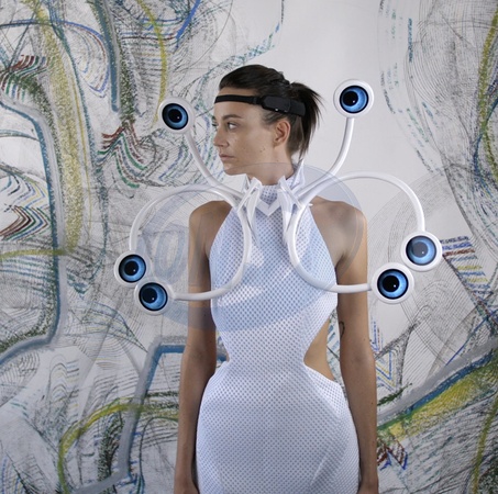 Pictures must credit: Anouk Wipprecht A mind-controlled 3D-printed dress offers the ultimate in personal fashion — thanks to built-in displays that respond to the wearer's brain waves. Called Screendress, it was created by Dutch fashion tech designer Anouk Wipprecht. It incorporates a brain interface that measures cognitive load in real-time, this dress shows you how much stimulus the brain gets at any given time. The term 'cognitive load' refers to the amount of information our working memory can process at any moment. The dress shows the wearer's cognitive load to the outside world. Fashion becomes a new kind of interconnection controlled by subconscious signals from the wearer's brain. These signals are picked up using a new cutting-edge EEG sensor contained in a headband that forms a wearable brain-computer interface. The interface uses machine-learning to determine the mental workload of the wearer. The workload is then reflected in real time on the six circular displays flaring out from the dress's sculpted neckpiece. As the wearer's mental workload increases , each display shows an iris and pupil dilating wider and wider. Picture supplied by JLPPA