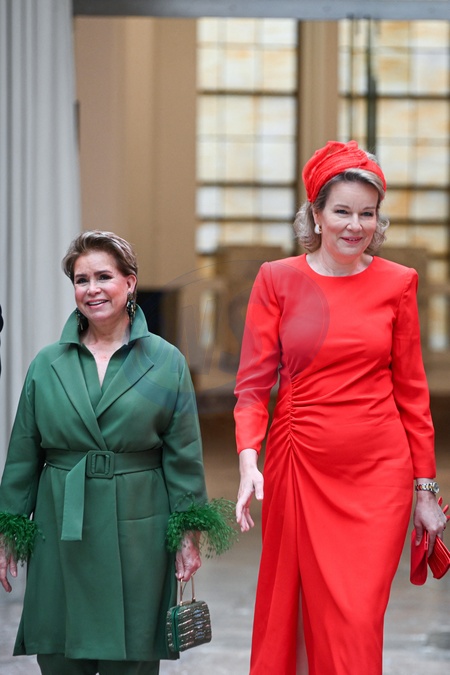 La reine Mathilde de Belgique et la grande-duchesse Maria Teresa de Luxembourg lors de la visite de l'exposition surréaliste Bozar avec Dali et Magritte à Bruxelles, le 17 avril 2024. Le Grand Duc et la Grande Duchesse de Luxembourg sont en visite officielle en Belgique. State visit of Their Royal Highnesses the Grand Duke and Grand Duchess of Luxembourg to Belgium. Visit to Bozar Surrealist exhibition with Dali and Magritte pictured on April 17, 2024 in Brussels, Belgium. April 17th, 2024.