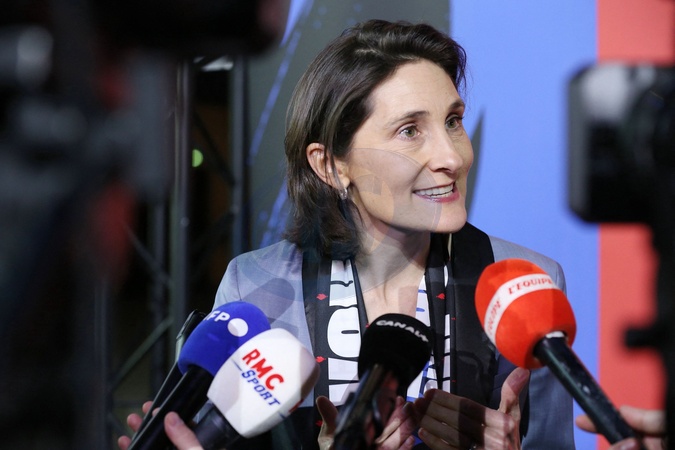 Amélie Oudéa-Castéra, ministre des Sports et des Jeux olympiques et paralympiques - Présentation au Grand Palais Ephémère, des tenues (réalisées par la marque de luxe Berluti) qui seront portées par les athlètes lors de cérémonie d'ouverture des Jeux Olympiques de PARIS2024. Paris, le 17 avril 2024. Presentation at the Grand Palais Ephémère, outfits (made by the luxury brand Berluti) which will be worn by the athletes during the opening ceremony of the PARIS2024 Olympic Games. Paris, April 17, 2024.