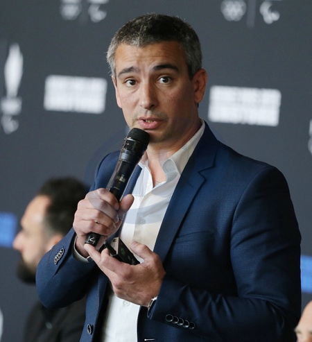 Yann Cucherat - Présentation au Grand Palais Ephémère, des tenues (réalisées par la marque de luxe Berluti) qui seront portées par les athlètes lors de cérémonie d'ouverture des Jeux Olympiques de PARIS2024. Paris, le 17 avril 2024. Presentation at the Grand Palais Ephémère, outfits (made by the luxury brand Berluti) which will be worn by the athletes during the opening ceremony of the PARIS2024 Olympic Games. Paris, April 17, 2024.