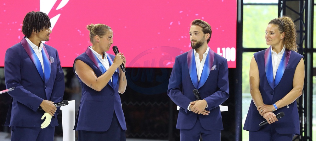 Melina Robert-Michon, Romain Cannone, Arnaud Assoumani et Pauline Deroulede - Présentation au Grand Palais Ephémère, des tenues (réalisées par la marque de luxe Berluti) qui seront portées par les athlètes lors de cérémonie d'ouverture des Jeux Olympiques de PARIS2024. Paris, le 17 avril 2024. Presentation at the Grand Palais Ephémère, outfits (made by the luxury brand Berluti) which will be worn by the athletes during the opening ceremony of the PARIS2024 Olympic Games. Paris, April 17, 2024.