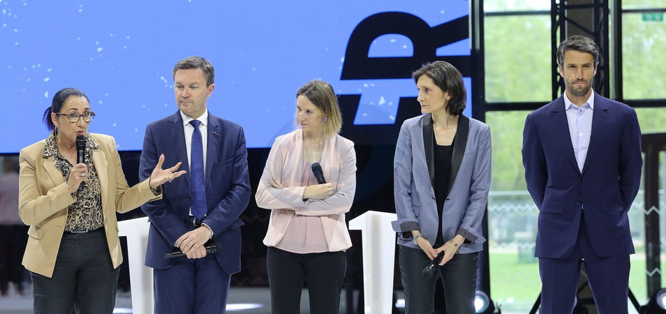 David Lappartient, Marie-Amelie, Le Fur Tony Estanguet, Amélie Oudéa-Castéra, ministre des Sports et des Jeux olympiques et paralympiques, et Fadila Khattabi - Présentation au Grand Palais Ephémère, des tenues (réalisées par la marque de luxe Berluti) qui seront portées par les athlètes lors de cérémonie d'ouverture des Jeux Olympiques de PARIS2024. Paris, le 17 avril 2024. Presentation at the Grand Palais Ephémère, outfits (made by the luxury brand Berluti) which will be worn by the athletes during the opening ceremony of the PARIS2024 Olympic Games. Paris, April 17, 2024.