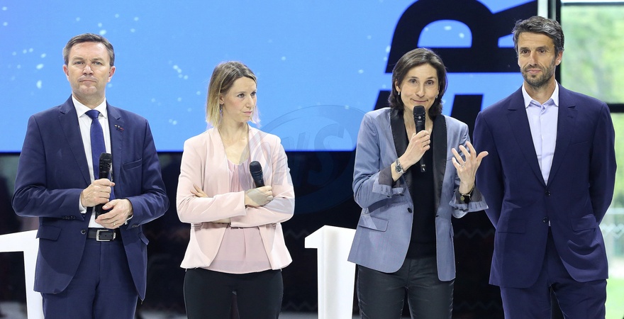 David Lappartient, Marie-Amelie Le Fur, Tony Estanguet, Amélie Oudéa-Castéra, ministre des Sports et des Jeux olympiques et paralympiques - Présentation au Grand Palais Ephémère, des tenues (réalisées par la marque de luxe Berluti) qui seront portées par les athlètes lors de cérémonie d'ouverture des Jeux Olympiques de PARIS2024. Paris, le 17 avril 2024. Presentation at the Grand Palais Ephémère, outfits (made by the luxury brand Berluti) which will be worn by the athletes during the opening ceremony of the PARIS2024 Olympic Games. Paris, April 17, 2024.