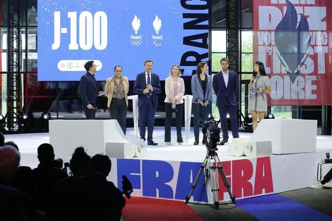 David Lappartient, Marie-Amelie Le Fur, Tony Estanguet, Amélie Oudéa-Castéra, ministre des Sports et des Jeux olympiques et paralympiques, et Fadila Khattabi - Présentation au Grand Palais Ephémère, des tenues (réalisées par la marque de luxe Berluti) qui seront portées par les athlètes lors de cérémonie d'ouverture des Jeux Olympiques de PARIS2024. Paris, le 17 avril 2024. Presentation at the Grand Palais Ephémère, outfits (made by the luxury brand Berluti) which will be worn by the athletes during the opening ceremony of the PARIS2024 Olympic Games. Paris, April 17, 2024.
