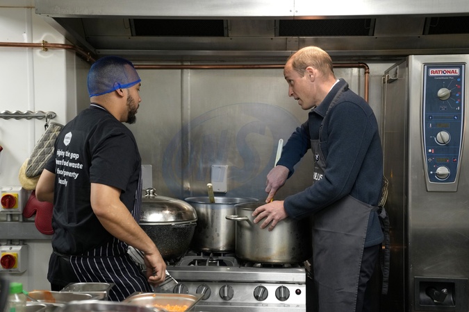 Britain's Prince William helps make bolognase sauce with head chef Mario Confait, during a visit to Surplus to Supper, in Sunbury-on-Thames, Surrey, England, Thursday, April 18, 2024. The Prince visited Surplus to Supper, a surplus food redistribution charity, to learn about its work bridging the gap between food waste and food poverty across Surrey and West London. NO UK USE FOR 48 HOURS, Credit:Avalon.red / Avalon