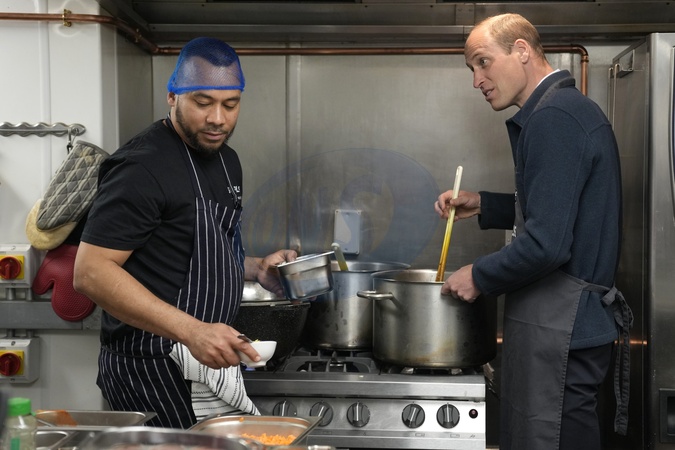 Britain's Prince William helps make bolognase sauce with head chef Mario Confait, during a visit to Surplus to Supper, in Sunbury-on-Thames, Surrey, England, Thursday, April 18, 2024. The Prince visited Surplus to Supper, a surplus food redistribution charity, to learn about its work bridging the gap between food waste and food poverty across Surrey and West London. NO UK USE FOR 48 HOURS, Credit:Avalon.red / Avalon