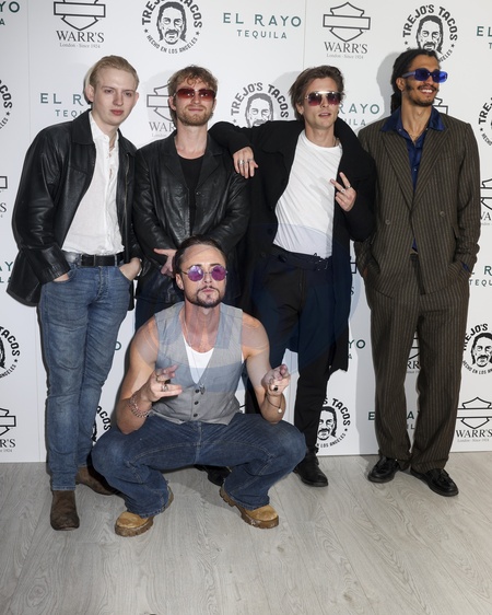 Dom Poots, Frederik Fekete Lysegaard, Elijah Rowen, Kelvin Kinder Bueno and Jack McEvoy at the Trejo's Tacos VIP Launch Party at the Trejo's Tacos in Notting Hill, London, United Kingdom on 18 April 2024., Credit:Cat Morley / Avalon