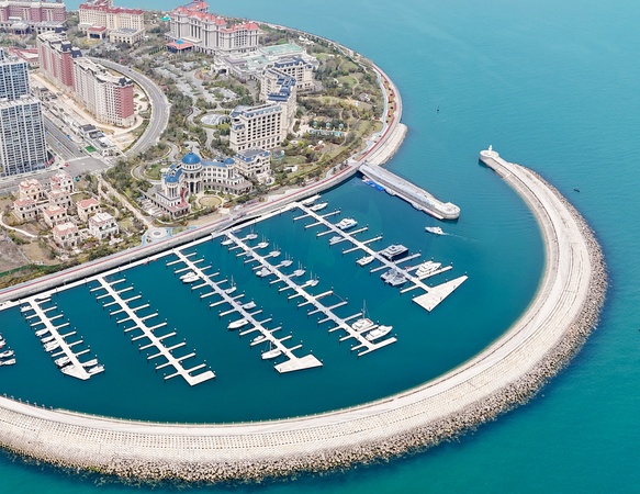 An aerial view of an artificial island named Starlight in Qingdao in east China's Shandong province Friday, April 19, 2024. The island, developed by Wanda Group, features theatres, luxury hotels, condo buildings and other tourism or leisure attractions., Credit:ZHANG JINGANG / Avalon