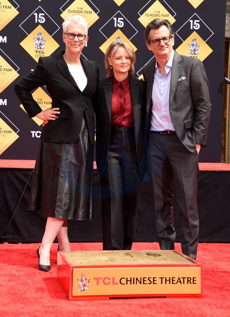Jamie Lee Curtis, Jodie Foster and Ben Mankiewicz arriving at the Jodie Foster Hand and Footprint Ceremony as part of the 2024 TCM Classic Film Festival held at the TCL Chinese Theatre in Hollywood, CA on April 19, 2024. © Janet Gough / AFF-USA.COM