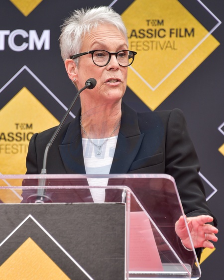 HOLLYWOOD, LOS ANGELES, CALIFORNIA, USA - APRIL 19: Jamie Lee Curtis speaks onstage during the 15th Annual TCM Classic Film Festival 2024 - TCM Hosts Handprint And Footprint Ceremony Honoring Jodie Foster held at the TCL Chinese Theatre IMAX Forecourt on April 19, 2024 in Hollywood, Los Angeles, California, United States., Credit:Image Press Agency / Avalon