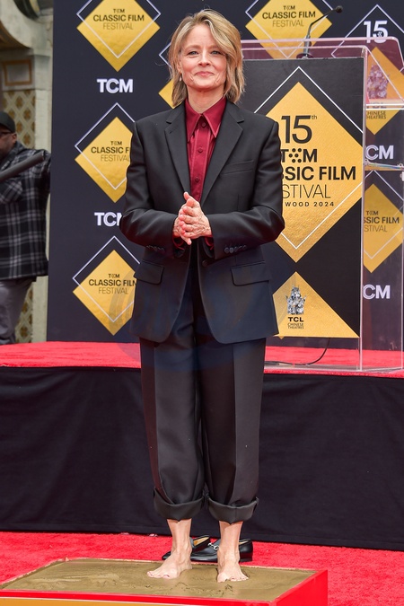HOLLYWOOD, LOS ANGELES, CALIFORNIA, USA - APRIL 19: Jodie Foster steps in cement barefoot during the 15th Annual TCM Classic Film Festival 2024 - TCM Hosts Handprint And Footprint Ceremony Honoring Jodie Foster held at the TCL Chinese Theatre IMAX Forecourt on April 19, 2024 in Hollywood, Los Angeles, California, United States., Credit:Image Press Agency / Avalon