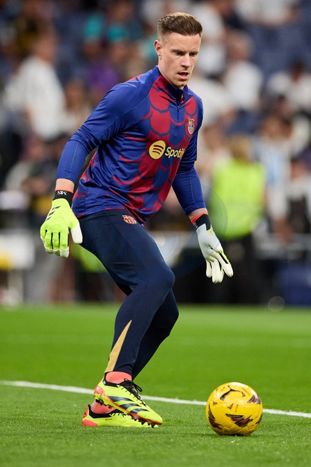 Marc Andre ter Stegen of FC Barcelona warming up during the LaLiga EA Sports match between Real Madrid and Barcelona FC at Stadium Santiago Bernabeu on April 21, 2024 in Madrid, Spain. (Photo by: Alvaro Medranda/ Panoramic)