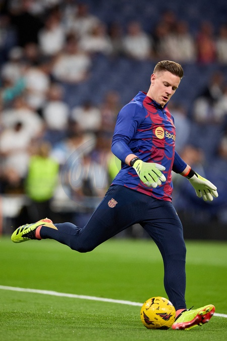 Marc Andre ter Stegen of FC Barcelona warming up during the LaLiga EA Sports match between Real Madrid and Barcelona FC at Stadium Santiago Bernabeu on April 21, 2024 in Madrid, Spain. (Photo by: Alvaro Medranda/ Panoramic)