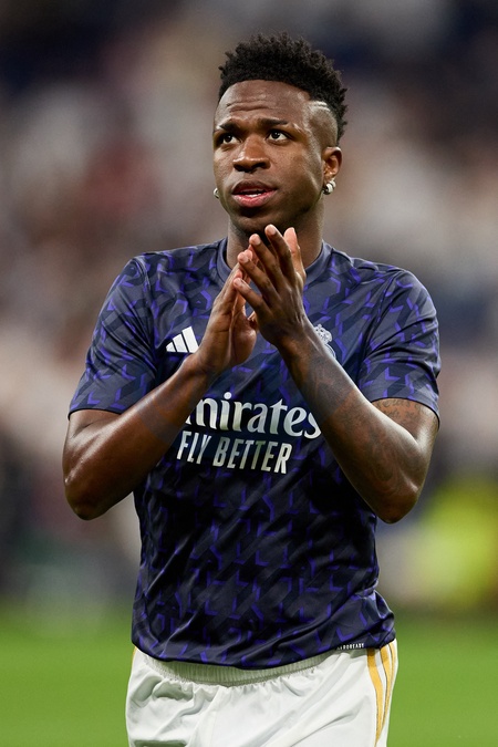 Vinicius Junior of Real Madrid CF thanks supporters for standing during the LaLiga EA Sports match between Real Madrid and Barcelona FC at Stadium Santiago Bernabeu on April 21, 2024 in Madrid, Spain. (Photo by: Alvaro Medranda/ Panoramic)