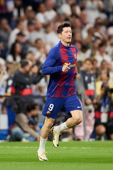 Robert Lewandowski of FC Barcelona warming up during the LaLiga EA Sports match between Real Madrid and Barcelona FC at Stadium Santiago Bernabeu on April 21, 2024 in Madrid, Spain. (Photo by: Alvaro Medranda/ Panoramic)