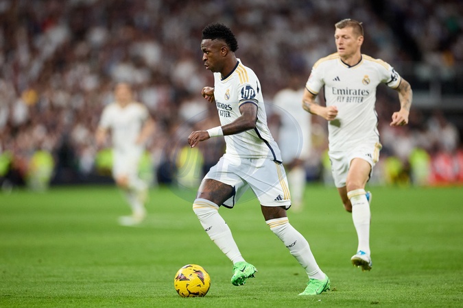 Vinicius Junior of Real Madrid CF runs with the ball during the LaLiga EA Sports match between Real Madrid and Barcelona FC at Stadium Santiago Bernabeu on April 21, 2024 in Madrid, Spain. (Photo by: Alvaro Medranda/ Panoramic)