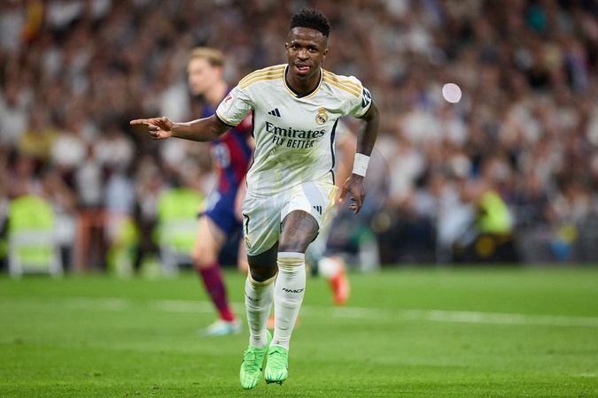 Vinicius Junior of Real Madrid CF celebrates his goal during the LaLiga EA Sports match between Real Madrid and Barcelona FC at Stadium Santiago Bernabeu on April 21, 2024 in Madrid, Spain. (Photo by: Alvaro Medranda/ Panoramic)
