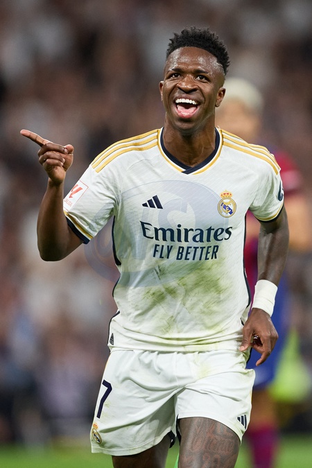 Vinicius Junior of Real Madrid CF celebrates his goal during the LaLiga EA Sports match between Real Madrid and Barcelona FC at Stadium Santiago Bernabeu on April 21, 2024 in Madrid, Spain. (Photo by: Alvaro Medranda/ Panoramic)