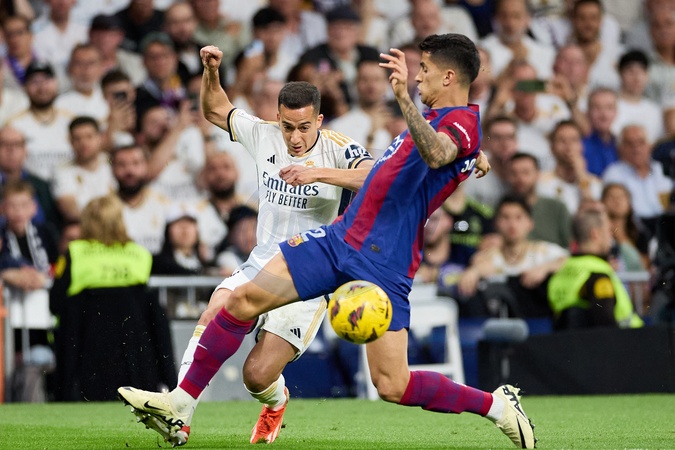 Lucas Vazquez of Real Madrid CF battles for the ball with Joa Cancelo of FC Barcelona during the LaLiga EA Sports match between Real Madrid and Barcelona FC at Stadium Santiago Bernabeu on April 21, 2024 in Madrid, Spain. (Photo by: Alvaro Medranda/ Panoramic)