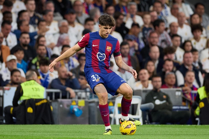 Pau Cubarsi of FC Barcelona passes the ball during the LaLiga EA Sports match between Real Madrid and Barcelona FC at Stadium Santiago Bernabeu on April 21, 2024 in Madrid, Spain. (Photo by: Alvaro Medranda/ Panoramic)