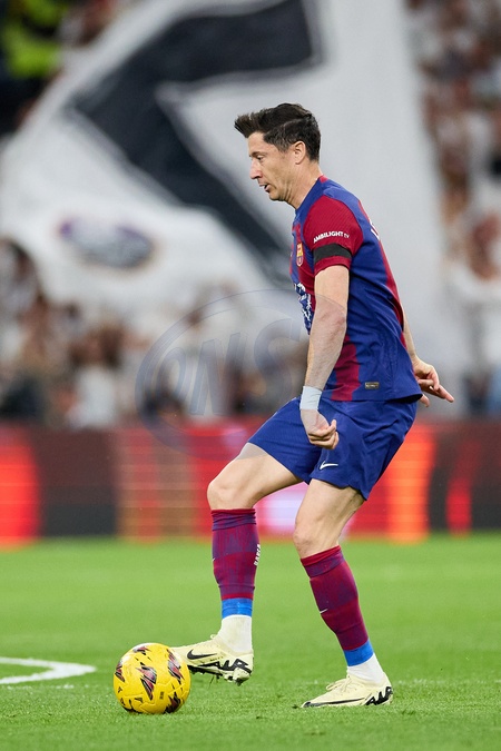 Robert Lewandowski of FC Barcelona passes the ball during the LaLiga EA Sports match between Real Madrid and Barcelona FC at Stadium Santiago Bernabeu on April 21, 2024 in Madrid, Spain. (Photo by: Alvaro Medranda/ Panoramic)