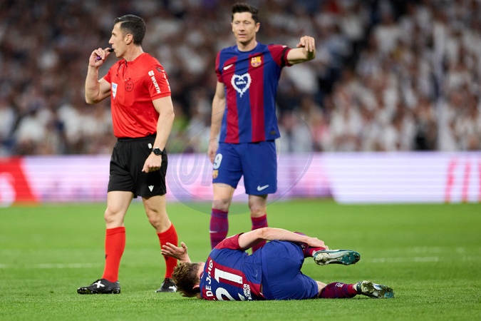 Frenkie de Jong of FC Barcelona lies injured during the LaLiga EA Sports match between Real Madrid and Barcelona FC at Stadium Santiago Bernabeu on April 21, 2024 in Madrid, Spain. (Photo by: Alvaro Medranda/ Panoramic)