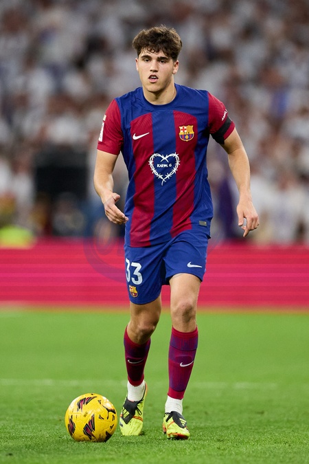 Pau Cubarsi of FC Barcelona runs with the ball during the LaLiga EA Sports match between Real Madrid and Barcelona FC at Stadium Santiago Bernabeu on April 21, 2024 in Madrid, Spain. (Photo by: Alvaro Medranda/ Panoramic)