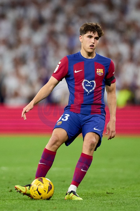 Pau Cubarsi of FC Barcelona runs with the ball during the LaLiga EA Sports match between Real Madrid and Barcelona FC at Stadium Santiago Bernabeu on April 21, 2024 in Madrid, Spain. (Photo by: Alvaro Medranda/ Panoramic)