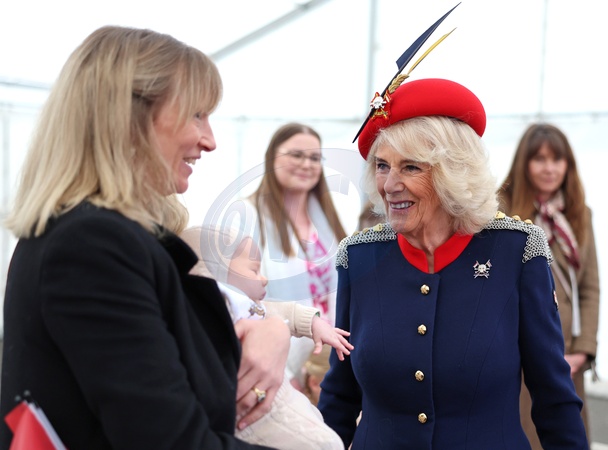Queen Camilla meets families and members of the Old Comrades Association (OCA) at a reception during a visit to The Royal Lancers on April 22, 2024 in Catterick, England. Queen Camilla undertakes her first visit to the Regiment since being appointed as their Colonel-in-Chief. The Queen's late father, Major Bruce Shand MC & Bar, served with the 12th Lancers during World War II. NO UK USE FOR 48 HOURS, Credit:Avalon.red / Avalon