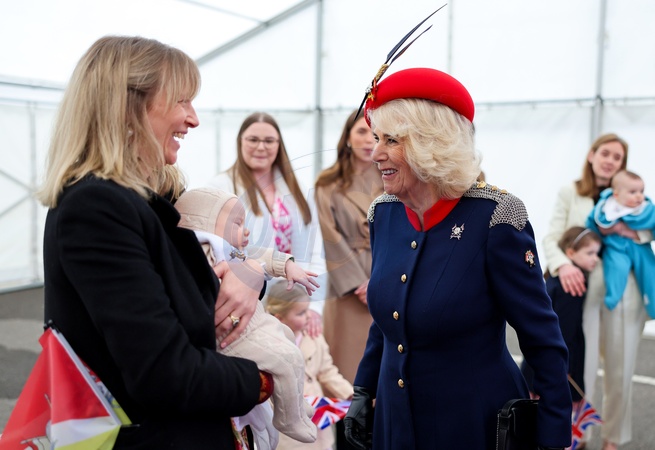 Queen Camilla meets families and members of the Old Comrades Association (OCA) at a reception during a visit to The Royal Lancers on April 22, 2024 in Catterick, England. Queen Camilla undertakes her first visit to the Regiment since being appointed as their Colonel-in-Chief. The Queen's late father, Major Bruce Shand MC & Bar, served with the 12th Lancers during World War II. NO UK USE FOR 48 HOURS, Credit:Avalon.red / Avalon