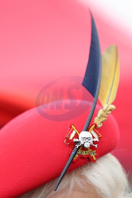 Queen Camilla, cap badge detail, during a visit to The Royal Lancers on April 22, 2024 in Catterick, England. Queen Camilla undertakes her first visit to the Regiment since being appointed as their Colonel-in-Chief. The Queen's late father, Major Bruce Shand MC & Bar, served with the 12th Lancers during World War II. NO UK USE FOR 48 HOURS, Credit:Avalon.red / Avalon