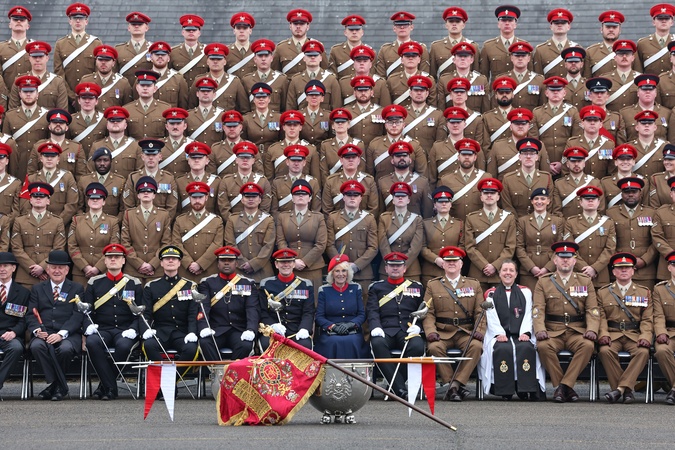 Queen Camilla poses for a group photograph with The Royal Lancers during a visit to The Royal Lancers on April 22, 2024 in Catterick, England. Queen Camilla undertakes her first visit to the Regiment since being appointed as their Colonel-in-Chief. The Queen's late father, Major Bruce Shand MC & Bar, served with the 12th Lancers during World War II. NO UK USE FOR 48 HOURS, Credit:Avalon.red / Avalon