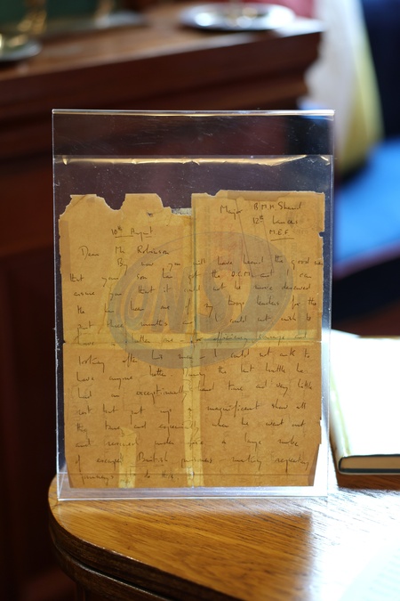 A letter signed by Queen Camilla's father Major Bruce Shand on display during a visit to The Royal Lancers on April 22, 2024 in Catterick, England. Queen Camilla undertakes her first visit to the Regiment since being appointed as their Colonel-in-Chief. The Queen's late father, Major Bruce Shand MC & Bar, served with the 12th Lancers during World War II., Credit:Chris Jackson / Avalon