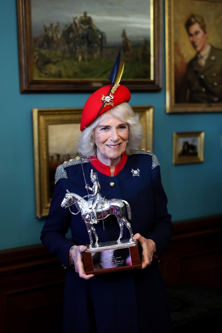 CATTERICK, ENGLAND - APRIL 22: Queen Camilla poses with a trophy which celebrates the first visit of the new Colonel-in-Chief during a visit to The Royal Lancers on April 22, 2024 in Catterick, England. Queen Camilla undertakes her first visit to the Regiment since being appointed as their Colonel-in-Chief. The Queen's late father, Major Bruce Shand MC & Bar, served with the 12th Lancers during World War II., Credit:Chris Jackson / Avalon