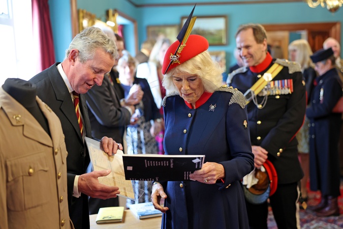CATTERICK, ENGLAND - APRIL 22: Queen Camilla views a photograph of Veteran Royal Lancers including Queen Camilla's own late father Major Bruce Shand on display during a visit to The Royal Lancers on April 22, 2024 in Catterick, England. Queen Camilla undertakes her first visit to the Regiment since being appointed as their Colonel-in-Chief. The Queen's late father, Major Bruce Shand MC & Bar, served with the 12th Lancers during World War II., Credit:Chris Jackson / Avalon