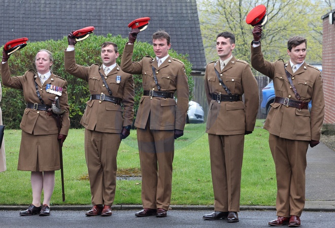 CATTERICK, ENGLAND - APRIL 22: Members of The Royal Lancers cheer as Queen Camilla departs a visit to The Royal Lancers on April 22, 2024 in Catterick, England. Queen Camilla undertakes her first visit to the Regiment since being appointed as their Colonel-in-Chief. The Queen's late father, Major Bruce Shand MC & Bar, served with the 12th Lancers during World War II., Credit:Chris Jackson / Avalon