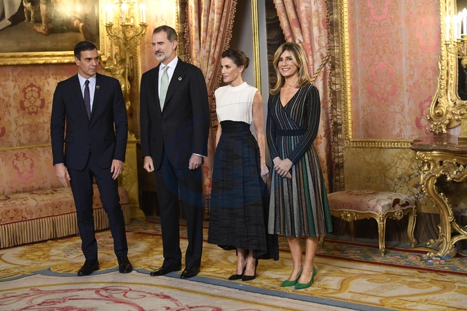 Espagne: Maria Begona Sanchez, femme de Pedro Sánchez, visée par une enquête pour corruption - Pedro Sanchez et sa femme Maria entourent le roi Felipe VI et la reine Letizia d'Espagne - Le roi Felipe VI et la reine Letizia d'Espagne donnent une réception à l'occasion de l'ouverture de la Cop25, conférence des Nations sur le changement climatique, au palais royal à Madrid, le 2 décembre 2019. Queen Letizia, King Felipe, Reception for Conference on Climate Change (COP25) at the Royal Palace in Madrid, Spain, December 2nd, 2019.