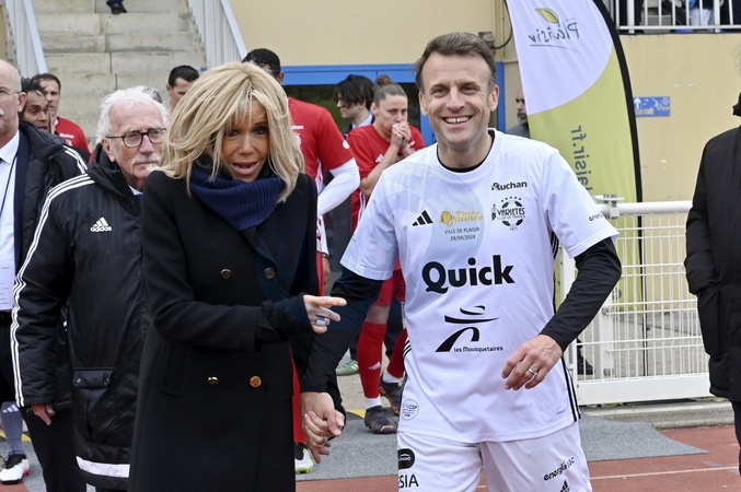 Le président de la République Emmanuel Macron en tenue de footballeur, accompagné de sa femme la Première Dame Brigitte Macron (présidente de la Fondation Hôpitaux de Paris-Hôpitaux de France) lors du match de football caritatif du Variétés club de France au profit de l'opération Pièces jaunes au stade Bernard Giroux à Plaisir, France, le 24 janvier 2024. © Eric Tschaen/Pool/Bestimage French President during the Varietes Club charity football match to benefit children in hospital at the Bernard Giroux stadium, in Plaisir near Paris, France, on April 24, 2024.